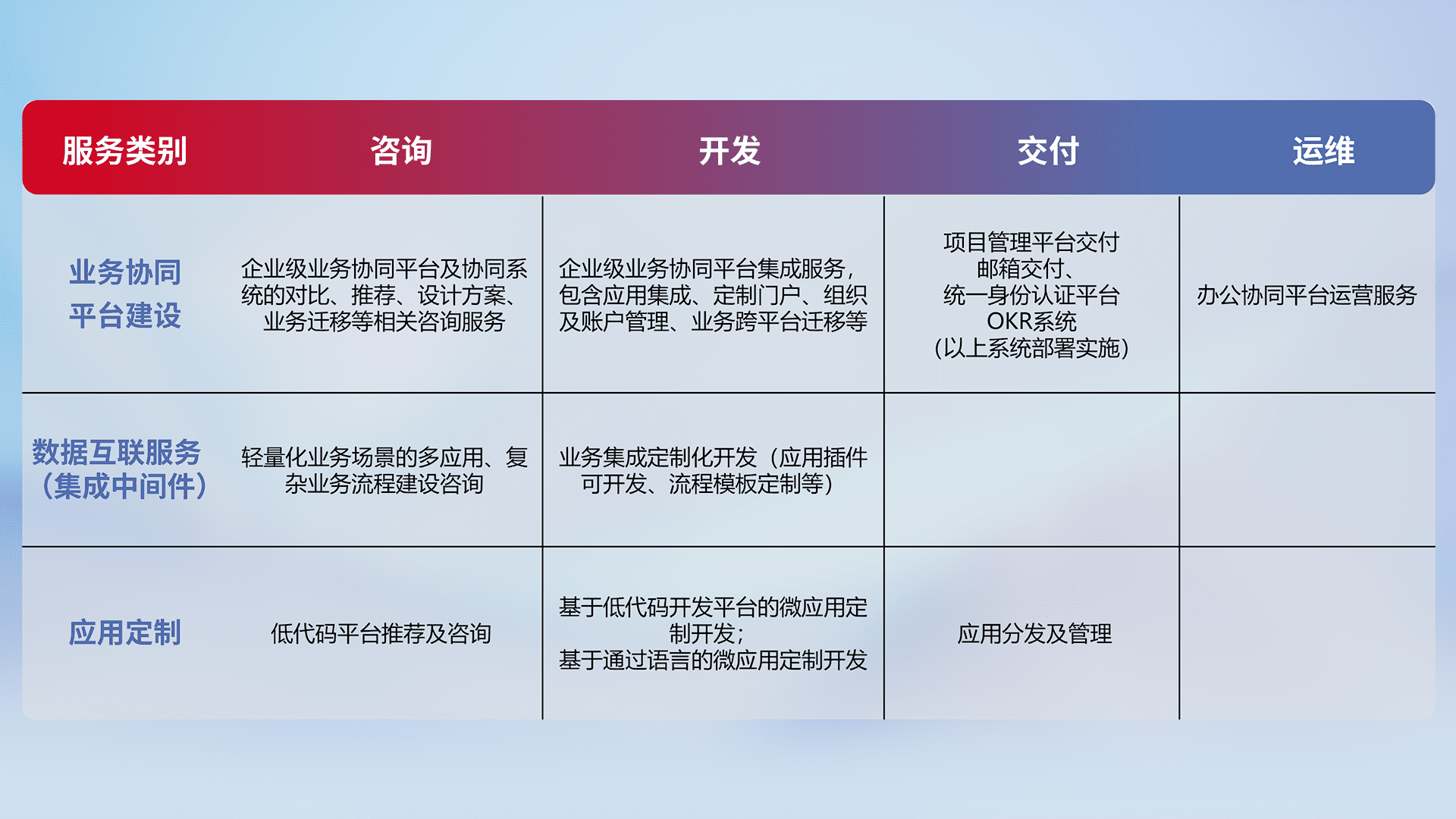 针对钉钉、、、企微、、、IDaas等平台级产品提供产品的规划、、、方案、、、交付、、定制化开发等服务,,,实现如统一协同办公、、智能客户服务、、混合会议管理、、、智能数据查询、、等业务场景,,,实现数字化转型。。