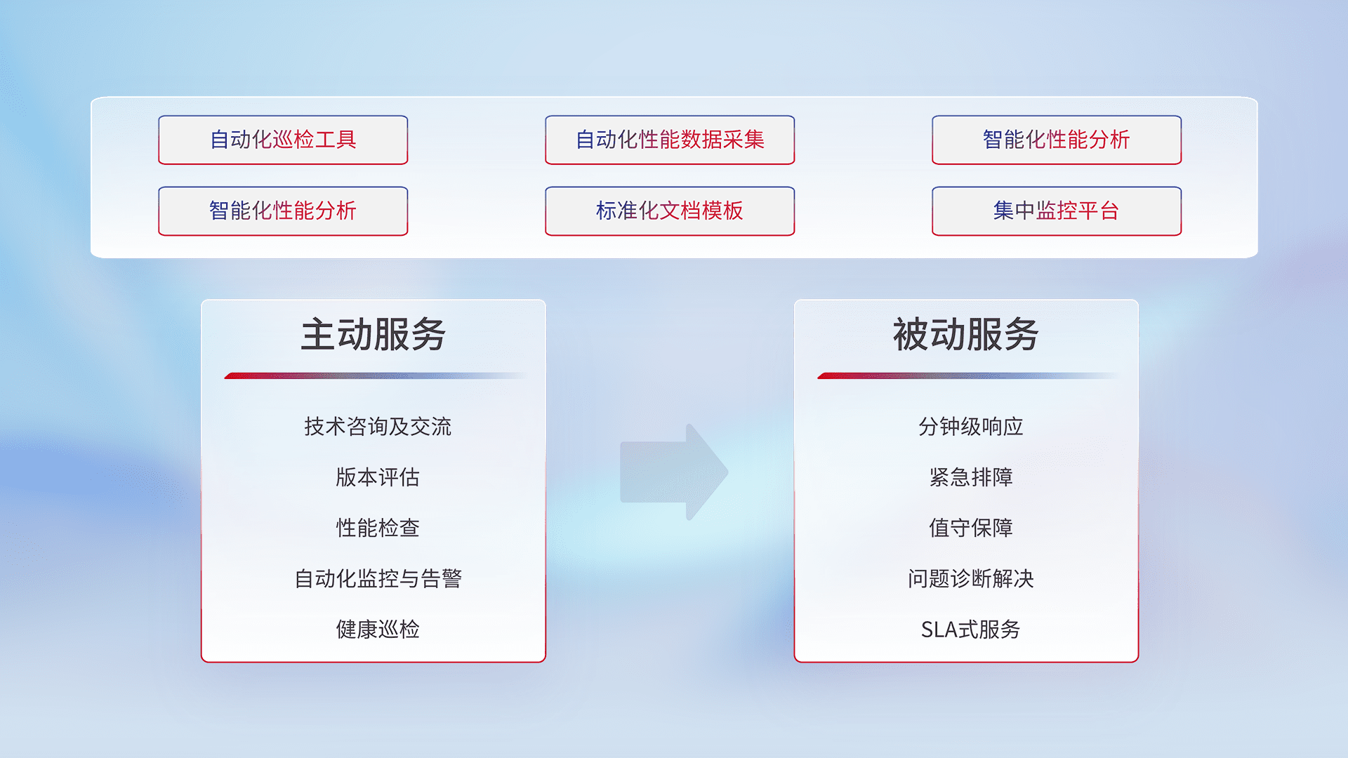 智能化工具和标准化文档,,保障服务质量,,,,提供主动服务(包含技术咨询、、、版本评估、、、性能检查、、、、自动化监控与告警、、、、健康巡检)和被动服务包含(分钟级响应、、、、紧急排障、、、、值守保障、、问题诊断解决、、、SLA服务)。。。