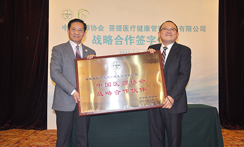 自2015年起至2025年由菩提医疗健康管理集团支持“中国医师奖”评选活动。。。会议现场,,,,集团董事长付钢先生与中国医师协会张雁灵会长签署了合作协议。。